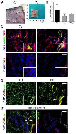Transplanted patches appeared vascularized at 7 days (Figure 2B), confirming CAM assay results. The amount of hemoglobin (Hb) quantified on the harvested DD patches, corroborated the previous data with a tendency of Hb to increment with time, suggesting also a functional angiogenesis with perfused vessels inside the applied patch (Figure 2C). Immunofluorescence performed on DD excised 7 days post implant revealed the presence of αSMA+ vessels with uneven appearance and morphology (Figure 2D). Among all, some of them were αSMA+ but did not have any GFP+ cell inside, indicating the presence of empty vessels (Figure 2D, 7-day right inset). Fifteen days after implant, the majority of the analyzed vessels had a uniform shape and dimension as pointed out by the presence of GFP+ cells inside the vessel structure (Figure 2D, 15-day right inset). To confirm the hypothesis that endothelial cells recolonized leftover vascular structures in the transplanted matrix, HUVEC were seeded in vitro on top of the DD and 48 h later their migration was analyzed. The vast majority of pre-existing vascular structures was recognized by HUVEC (CD31+ cells), confirming the influence of old vasculature structure on patch angiogenic features and host endothelial cell behavior (Figure 2D,E)