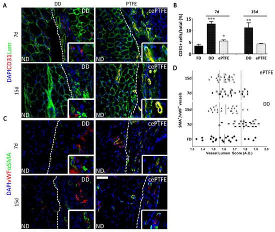 We co-stained αSMA as a vessels perimetric marker, together with vWF to confirm both vessel function and luminal size, which allowed the measurement of the vessel size (Figure 3C,D). In the DD implants, at 7 days postsurgery the distribution was between small and mid-size vessels (from 2.0 to 1.75, and from 1.75 to 1.55, respectively), then after 15 days it resembled a physiological condition (vessel diameter from 1.55 to lower values) (Figure 3D). On the contrary, at the interface between ePTFE and ND, vessels had a distribution similar to native condition 7 days postsurgery, whereas middle-size vessels appeared at the later time point (Figure 3D).