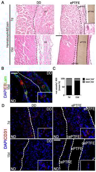 Having demonstrated formation of functional vasculature, we evaluated DD angiogenic properties by orthotopic implantation (Figure 3). Patches were applied on host diaphragm, in order to challenge the DD with a physiological environment, without any local injury. We compared the angiogenic effect exerted by our scaffold with that of ePTFE, a prosthetic patch already used in clinic [27]. From the histological point of view, the H & E staining showed that the biological DD underwent remodeling coherently to the outcome seen during the previous characterization [26], while ePTFE was encapsulated by a thick cellular layer, suggesting a beginning of foreign body reaction (Figure 4A).