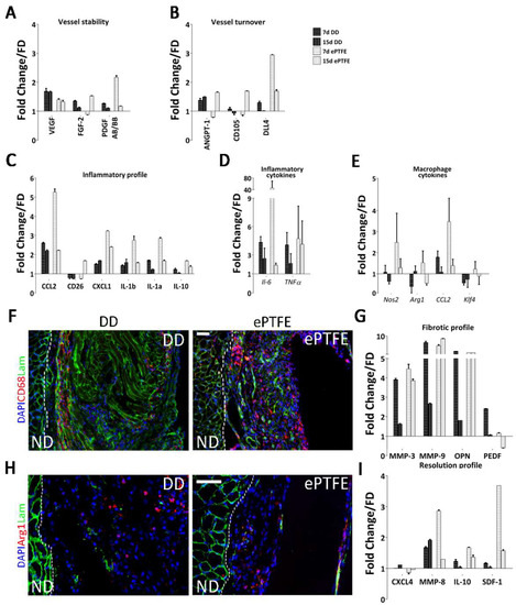 Considering the immunomodulation of the innate immune system [60], it is now established that constructive remodeling requires a fine-tuned balance in immune system cell intervention, not only to avoid rejection of the graft, but also to avoid the establishment of a chronic response [61,62]. In particular, macrophages were found to be of paramount significance, being a heterogeneous population influencing inflammation, angiogenesis, and fibrosis, both directly and indirectly [63,64]. In this respect, DD implants displayed a balanced presence of cytokines and chemokines (e.g., FGF2, CXCL4, Il-10, MMP-3, MMP-8, MMP-9, PEDF) known to be up- or downregulated by cells of the immune system to keep the physiological equilibrium as already shown [26] and involved in the remodeling of ECM, which can in turn be supportive of angiogenesis [65,66]. In this context, Real Time PCR confirmed previous results of a specific time course in macrophage polarization, from M1 to M2, in DD-transplanted animals, while ePTFE triggered an abrupt increase in the mRNA expression of Il-6, TNFα, Nos2, and Ccl2, commonly associated with inflammatory cells. The overall profile suggested that differently polarized macrophages were present simultaneously, probably due to the management of the fibrotic capsule surrounding the foreign material [67,68,69,70,71,72].