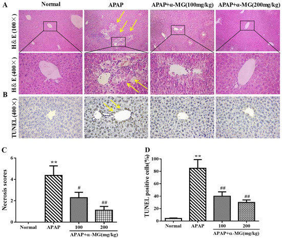 Inhibition of APAP-induced acute liver injury by α-MG. Representative sections of liver stained with hematoxylin and eosin (H&E), (100×, 400×) for histopathological observations. Hepatocellular necrosis was marked by arrows (A). The degrees of damage were accessed by necrosis scores (C). Analysis of apoptosis in mice was evaluated by TUNEL staining (B). Representative liver sections were stained with TUNEL (400×). The TUNEL positive cells percentage is shown in (D); All data are expressed as mean ± S.D., n = 8. ** p < 0.01 vs. normal group; ## p < 0.01 or # p < 0.05 vs. APAP group.