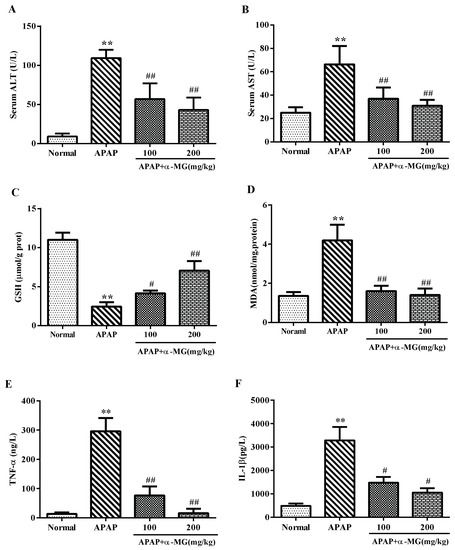Effects of α-MG on serum enzyme activity, oxidative stress, and inflammatory responses. ALT (A); AST (B); GSH (C); MDA (D); TNF-α (E) and IL-1β (F) levels from mice in each experimental group were determined by commercial kits. All data are expressed as mean ± S.D., n = 8. *** p < 0.001 or ** p < 0.01 vs. normal group; ### p < 0.01 or ## p < 0.01 vs. APAP group.
