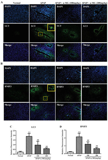 Inhibition of APAP-induced autophagy by α-MG. The expression of LC3 (A) and BNIP3 (B) in liver tissues from each experimental group was determined by immunofluorescence; The fluorescence intensity of LC3 (C) and BNIP3 (D) (green fluorescent) was accessed by photodensitometry. Representative immunofluorescence images were taken at 200×. DAPI (4′,6-diamidino-2-phenylindole4, blue) was used as a nuclear counterstain. All data are expressed as mean ± S.D., n = 8. ** p < 0.01 vs. normal group; ## p < 0.01 vs. APAP group.