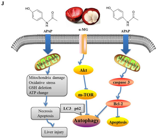Recently, extracts of traditional medicinal plants have shown specific health effects. Mangosteen (Garcinia mangostana) is a well-known tropical evergreen tree and has been used as a traditional medicine for centuries [12]. As major secondary metabolites of mangosteen, xanthones are assumed to be the major active substances. Previous studies have shown that the proportion of α-mangostin (α-MG, Figure 1) in the xanthone complex of mangosteen is high. The biological activities of α-MG have led to it being used for several decades due to it being abundant, easy to obtain, inexpensive, and biologically safe [13]. As the most important secondary metabolite in the plant, α-MG demonstrates a wide variety of pharmacological effects including anti-inflammation [14,15], anti-oxidant [16], anti-apoptosis, antibacterial [17], and anti-Alzheimer’s disease [18]. α-MG was reported to significantly ameliorate hepatic steatosis in vivo [19,20]. In addition, α-MG was shown to reduce the risk of liver fibrosis on thioacetamide-induced cirrhosis in rats [21]. Based on accumulating evidence on liver cirrhosis in vivo, it is possible that APAP-induced hepatic injury may cause further liver fibrosis. The working hypothesis here is that α-MG may have the capacity to prevent APAP-induced hepatotoxicity due to its protective effect against liver fibrosis and anti-apoptosis effect. Considering that APAP-induced hepatotoxicity can lead to inflammation, oxidative stress, autophagy, and cellular necrosis, a study of the protective effects of α-MG and relevant molecular mechanisms were undertaken.