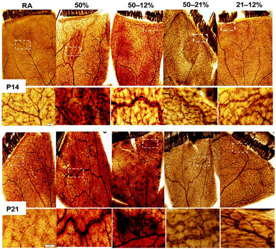 Representative retinal flatmounts demonstrating the effects of neonatal IH paradigms on retinal vascular integrity at P14 and P21. Retinas were stained with ADPase. Images are 10× magnification and the scale bar is 100 µm. White dotted line boxes indicate higher magnification (20×, scale bar 50 µm) images in the panels below.