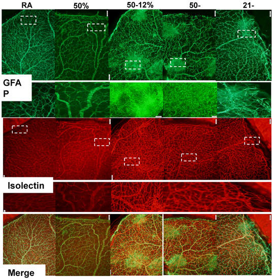 One of the best-known biomarkers for astrocytes and activated Müller cells is glial fibrillary acidic protein (GFAP), the chief constituent in astrocytes. Astrocytes are found only in the NFL/GCL, they exist proximal to the inner retinal vasculature, and provide guidance cues and structure to the retinal vessels. Isolectin B4 is a specific endothelial cell marker that labels blood vessels. Figure 2 represents retinas stained for GFAP (green) and isolectin B4 (red) at P21. The bottom panel represents the merged images. Data show major disturbances in the astrocyte template and increased vascular abundance, vascular overgrowth, vascular tufts, and enlarged vessels at the periphery in all study groups compared to normoxic age-matched controls.