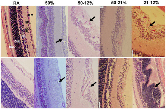 Figure 3 shows the H&E stained retinal layers at P14 (upper panel) and P21 (lower panel). The RA control group at P14 is presented at 20× magnification for identification of all retinal layers. All other images are presented at 40× magnification. The images show widening of the NFL/GCL, increased number of cells, disruption of the ILM, and violation of the vitreous fluid in all study groups at P14 and P21 (arrows). Exposure to 50% O2 resulted in abnormalities in the ONL and detachment of the rods and cones (R&C, arrows). At P21, thickening of the NFL/GCL and elevations in cell numbers persisted in all study groups. Exposure to 50% O2 resulted in enlarged vessels, and major disruption of the NFL/GCL and inner plexiform layer (IPL) layers. Quantitative analysis of the retinal layers (Table 4) resulted in increased overall retinal thickness in all study groups, except the group exposed to 50% O2, which showed overall retinal thinning as well as reduced ONL thickness. Exposure to 50–12% IH induced increased retinal thickness in all areas. Exposure to 21–12% IH increased retinal, NFL/GCL, and ONL thickness, while exposure to 50–21% O2 increased retinal and NFL/GCL thickness. Tortuosity index and diameter of vessels increased in the 50% O2 and 50–12% IH group, exposure to 21–12% IH resulted in higher tortuosity index and venous diameter, and exposure to 50–21% O2 increased tortuosity index only (Table 3).