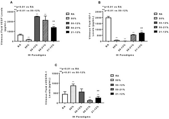 The vitreous fluid (VF) is a reservoir for growth factors in the eye. Levels of angiogenesis biomarkers in the vitreous fluid at P21 are presented in Figure 4. No samples were collected at P14, due to low VF volume. VEGF (panel A) in the VF declined with 50% O2 and increased in the IH and 50–21% O2 groups, although the highest increase occurred with 50–12% and the lowest with 21–12%, resulting in a significant difference between the two groups. In contrast, IGF-I (a permissive factor for VEGF), declined in all study groups compared to RA. The most significant reductions occurred with 50% O2 and 50–12% groups, resulting in a significant difference between the two IH groups (panel B). Soluble VEGF receptor (sVEGFR)-1 is a splice variant of the membrane type VEGFR-1. It acts as an endogenous VEGF “trap” and reduces the availability of VEGF to its membrane receptor, decreasing VEGF action. sVEGFR-1 in the VF (panel C) increased with 50% O2 and declined in the 50–21% O2 and 21–12% IH groups. Of the two IH groups, exposure to 21–12% significantly lowered sVEGFR-1 levels in the VR compared to exposure to 50–12%.