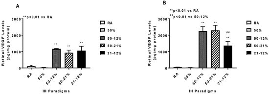 Animals randomized to oxygen cycling were placed with the dams in specialized oxygen chambers attached to an oxy-cycler (BioSpherix, New York, NY, USA). The animal chambers housed two rat cages, were optimized for gas efficiency, and provided adequate ventilation for the animals in a controlled atmosphere with minimal gas usage. Oxygen content inside the chamber was continuously monitored and recorded on a Dell Computer. Carbon dioxide in the chamber was monitored and removed from the atmosphere by placing soda lime within the chamber. Two IH paradigms were employed: (1) consisting of an initial exposure of Hx (50% O2) for 30 min followed by three brief, 1 min, clustered hypoxic events (12% O2), with a 10 min recovery in 50% O2 between each IH event (Figure 8A). This model of IH was developed and refined in our laboratory. It mimics a preterm newborn with brief, recurrent apnea and desaturations, and simulates babies who are bagged with oxygen during an IH episode. Reoxygenation in 50% O2 followed each clustered IH event for 2.4 h for a total of eight clustered IH episodes per day for 14 days, as previously described [45,46,47,48,49,50,51,52,53]; and (2) consisting of an initial exposure of normoxia (21% O2) for 30 min followed by three brief, 1 min, clustered hypoxic events (12% O2), with a 10 min recovery in 21% O2 between each IH event (Figure 8C). This model simulates preterm infants who are bagged with room air during an IH event and recover in normoxia. Reoxygenation in 21% O2 followed each clustered IH event for 2.4 h for a total of eight clustered IH episodes per day for 14 days, as previously described [45]. The 50–21% O2 profile is presented in Figure 8B. Animals were studied at P14 to determine immediate effects, or at P21, to determine whether the responses resolve following reoxygenation in RA for 1 week. Oxygen saturation was confirmed on a sentinel unanesthetized rat pup from each group using the MouseOx Pulse Oximeter and WinDaq Waveform Browser software (STARR Life Sciences Corp., Oakmont, PA, USA) before and after exposure. The cecal period (conception to eye opening) was recorded to determine the effects of IH on retinal neural maturation [77,78,79]. Percentage changes in body and organ (brain and lungs) weight and body length were assessed at P14 and P21. Blood samples (mixed venous and arterial) were collected for serum levels of angiogenesis factors (VEGF, sVEGFR-1, and IGF-I). Eyes were collected for vascular and astrocyte integrity, retinal layer integrity, retinal morphometry, and angiogenesis biomarkers.