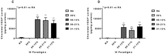 Retinal and choroidal VEGF levels are presented in Figure 5. Panels A and C represent data at P14 and panels B and D represent data at P21. Retinal and choroidal VEGF levels increased in the IH and 50–21% groups at P14 and remained elevated at P21, however, the levels at P21 were much higher compared to those at P14. Exposure to 21–12% IH produced significantly lower retinal VEGF levels at P21 compared to 50–12% IH.