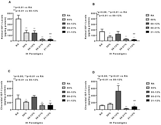 Retinal and choroidal IGF-I levels are presented in Figure 7. Retinal IGF-1 levels declined in the IH and 50–21% O2 groups at P14 (panel A) and remained suppressed in the 50% O2, 50–21% O2, and 21–12% IH groups at P21 (panel B). Exposure to 21–12% IH produced lower retinal IGF-I levels at P14 and P21 compared to exposure to 50–12% IH. In the choroid, IGF-I was similarly suppressed in the 50% O2, 50–21% O2, and 21–12% IH groups at P14 (panel C). However, at P21, exposure to 50–12% IH resulted in higher IGF-I levels, while the levels remained suppressed with 50–21% O2 and 21–12% IH exposure (panel D). This resulted in significant differences between the two IH groups at P21.