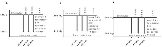 Graphic representation of the neonatal IH paradigms used in this study. Hyperoxia (50% O2) following a brief, repetitive hypoxia (12% O2) is presented in (A). Hyperoxia (50% O2) following a brief, repetitive normoxia (21% O2) is presented in (B). Normoxia (21% O2 with brief episodes of hypoxia (12% O2) is presented in (C).