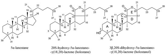 Structures of lanostane, holostane and holostanol. A, B, C, D, E: rings of the pentacyclic triterpene.