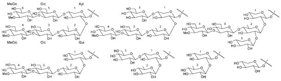 Some common carbohydrate architectures in the sea cucumber triterpene glycosides. The sugar moieties are 3-O-methyl-d-glucose (MeGlc), d-glucose (Glc), d-xylose (Xyl), d-quinovose (Qui), 3-O-methyl-d-xylose (MeXyl) [].