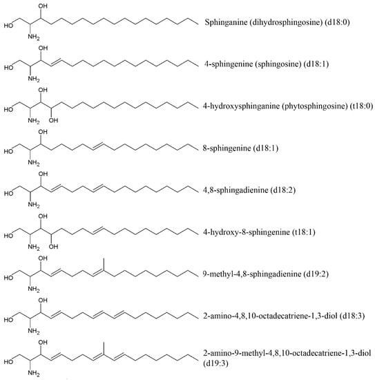 Cerebrosides, neutral glycosphingolipids, are composed of two different structural units: hexose (glucose for glucocerebrosides or galactose for galactocerebrosides) and ceramide constituted of a sphingoid base, also called a long-chain base (LCB), and an amide-linked fatty acid (FA). Ceramide formation occurs through a β-glycoside bond between the hydroxide radical at C-1 of ceramide and hexose [] (Figure 7). The most common sphingoid base of mammalian sphingolipids is sphingosine (4-sphingenine, d18:1) usually attached to a branched 2-OH or non-hydroxyl alkyl within 16–24 carbon atoms. Sphinganine (dihydrosphingosine, d18:0), phytosphingosine (4-hydroxysphinganine, t18:0) and some others are often found in small amounts. Sphingoid bases from plants include d18:1, d18:2, and 4-hydroxy-8-sphingenine (t18:1) (Figure 8).