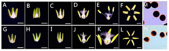 Comparison of plant anthers and I2–KI staining in sterile/fertile conditions (AF: (A–F,M); AS: (G–L,N)). (A,G) Tetrad stage; (B,H) early uninucleate stage; (C,I) later uninucleate stage; (D,J) binucleate stage; and (E,F,K,L) trinucleate stage. Scale bars are 500 μm in (A–F) and (G–L); 50 μm in (M,N).