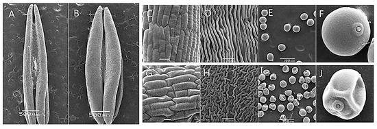 Comparison of scanning electron micrographs of AF (B–F) and AS (A,G–J). (C,D,G,H) outer epidermal ells; (E,F,I,J) trinucleate cells. Scale bars are 500 μm in (A,B); 100 μm in (C,E,G,I); 5 μm in (D,H); and 30 μm in (F,J).