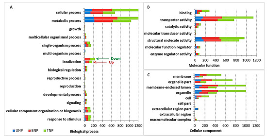 Gene Ontology (GO) analysis of the differentially abundant proteins (DAPs). (A) Biological process; (B) Molecular function; (C) Cellular component. The vertical axis shows the annotations of the GO classifications for DAPs. The horizontal axis represents the numbers of proteins annotated in each pathway, i.e., cellular components, molecular function, and biological process, and the proportion represents the number of proteins. UNP represents the uninucleate stage proteins, BNP represents the binucleate stage proteins, and TNP represents the trinucleate stage proteins. Red arrows indicate the decreased expression of DAPs and green arrows denote the increased expression of DAPs.