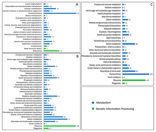 We also made comparisons with the KEGG database in order to predict possibly important pathways. The results indicated the main DAPs enriched in the top 20 pathways in each stage (Figure 5, and detailed information is provided in Supplementary Table S6) mainly comprised ribosome, starch and sucrose metabolism, carbon metabolism, photosynthesis, biosynthesis of amino acids, phenylpropanoid biosynthesis, fructose and mannose metabolism, and carbon fixation in the photosynthetic organism. For the ribosome pathway, numerous DAPs were enriched in the three stages (100 in UNP, 101 in BNP, and 86 in TNP), where many of the DAPs that increased/decreased in each stage were associated with anther development and fertility conversion. The DAPs related to starch and sucrose metabolism were highly enriched and most of these DAPs were annotated in the first two stages. The pollen development process is a metabolic process that involves starch and sugar accumulation, so we suggest that the DAPs related to starch and sucrose metabolism are involved with pollen development and fertility conversion. DAPs related to carbon metabolism and photosynthesis were also enriched, particularly those involved with energy metabolism in plants, photosynthesis and carbon fixation, and cytoplasmic and mitochondrial energy metabolism related to carbon metabolism. There were differences in the protein abundance levels (increased/decreased) in the three stages in fertile and sterile plants, such as NADP-dependent malic enzyme, acetyl-coenzyme Asynthetase, glucose-6-phosphate 1-dehydrogenase, and fructose-1,6-bisphosphatase (Table 1). Thus, we suggest that there is a need for more energy during anther and pollen development in fertile plants, thereby facilitating normal anther development and fertility conversion. Many studies have also shown that starch and sucrose metabolism, energy metabolism and protein degradation, and synthesis pathways play important roles in male sterility in plants based on quantitative proteomics [10,11,20]. However, the molecular mechanisms that allow these pathways to affect plant fertility conversion have rarely been studied. In addition, many of the DAPs identified in KTM3315A may regulate fertility conversion and these DAPs can provide a deeper understanding of the mechanism of male sterility.
