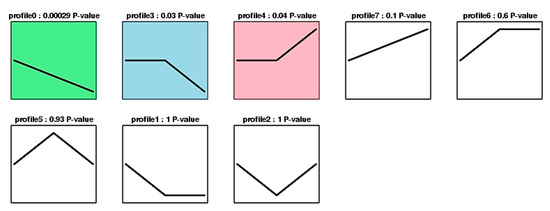 Cluster analysis of DAPs in AS and AF during different stages (UNP, BNP, and TNP). Based on fold changes of 1.2, the 127 DAPs could be divided into eight groups (profile 0 to 7) with correlated abundance patterns. The green represent profile 0; the blue represent profile 3; the red represent profile 4, were significantly different.