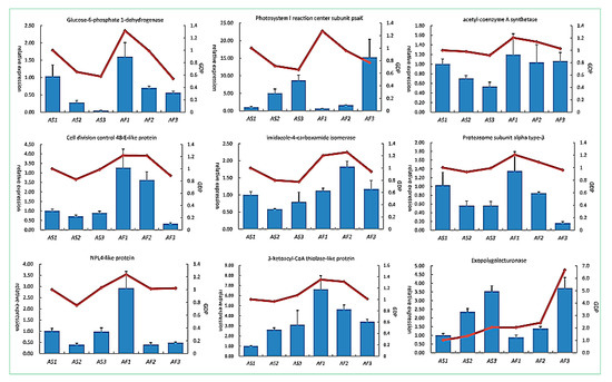 Expression levels of candidate DAPs according to qRT-PCR (histogram) and proteomics (line chart). qRT-PCR data represent the means based on three replicates and bars represent standard errors. GDP represents the level of expression of protein combined with proteomic data.