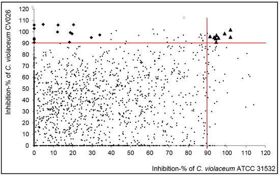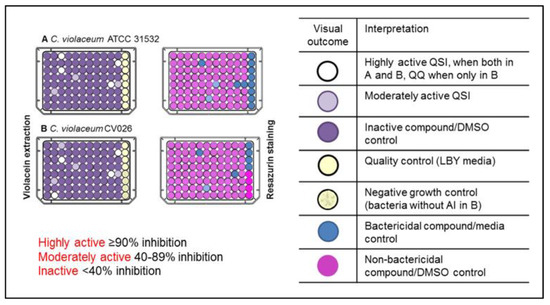 2.1. Primary Screening for Quorum Sensing Inhibitors (QSIs) Using Two Strains of C. violaceum as Reporter Bacteria and Classification of the Compounds