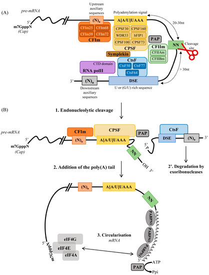 - Mandel, C.R.; Bai, Y.; Tong, L. Protein factors in pre-mRNA 3′-end processing. Cell. Mol. Life Sci. CMLS 2008, 65, 1099–1122. [Google Scholar] [CrossRef] [PubMed]