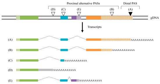 - Ji, Z.; Lee, J.Y.; Pan, Z.; Jiang, B.; Tian, B. Progressive lengthening of 3′ untranslated regions of mRNAs by alternative poly(A)denylation during mouse embryonic development. Proc. Natl. Acad. Sci. USA 2009, 106, 7028–7033. [Google Scholar] [CrossRef] [PubMed]