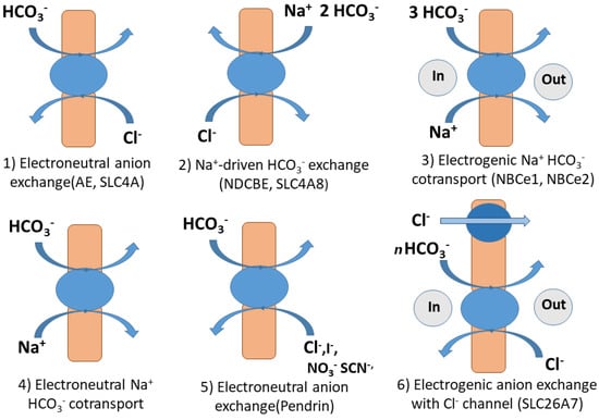 Different ways for HCO3− transport through the membranes in mammalian and human cells can be distinguished (see Figure 1). The first includes electroneutral, Na+- independent anion exchange between HCO3− and Cl− using anion exchange transporters (AE) encoded by genes of the SLC4A family. The second includes sodium-driven Cl−/HCO3− exchanger (NDCBE) encoded by SLC4A8. This transporter is thought to exchange 1 Cl− for 2 HCO3− and 1 Na+. The next transport mechanism comprises electrogenic Na+/HCO3−-cotransport performed by NCBT transporter proteins NBCe1 and NBCe2 encoded by SLC4A4 and SLC4A5. The fourth way is the electroneutral Na+- HCO3− cotransport or Na+-driven Cl−/HCO3− exchange through the transporter protein encoded by SLC4A10 [,,]. The fifth mechanisms involves electroneutral Cl−/HCO3− exchangers that also can exchange either I−, NO3−, SCN−, or formate encoded by SLC26A (Pendrin) or NO3−, OH−, SO42−, oxalate, and formate (SLC26A6). (Electrogenic Cl−/HCO3− exchange, with channel activity for Cl−, SO42−, and oxalate (SLC26A7) and Electrogenic Cl−/HCO3− exchange with Cl- channel activity, NaCl cotransport or Cl− -independent HCO3− transport (SLC26A9) are also HCO3− transport mechanisms [] (see Figure 1).