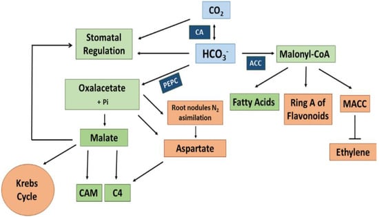 The CA-generated HCO3− serves as a substrate for different carboxylases among others acetyl-CoA carboxylase (ACCase, EC.6.4.1.2) and phosphoenolpyruvate carboxylase (PEPC, EC 4.1.1.31). ACCase contains a biotin carboxylase, a biotin carboxyl carrier protein, and a carboxyl transferase. It catalyzes the carboxylation of acetyl-CoA to malonyl-CoA in the chloroplast and the cytosol []. Malonyl-CoA is the precursor for fatty acid formation and elongation. Moreover, it participates in the biosynthesis of ring A of flavonoids through the polycetic pathway and in the biosynthesis of malonylated aminocyclopropane-1-carboxylic acid (MACC), which is involved in the down-regulation of ethylene production in plants (see Figure 2). Other biotin-containing carboxylases operating with HCO3− are 3-methylcrotonyl-CoA carboxylase, which is involved in the mitochondrial pathway of leucine catabolism. Geranyl-CoA carboxylase likely works in the metabolism of cyclic terpenes [,].