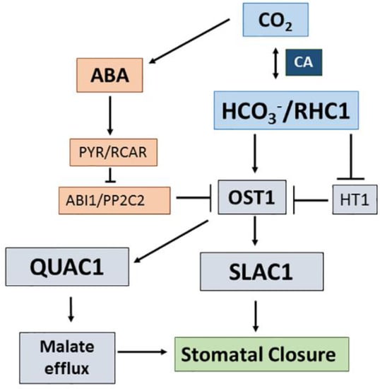 Regardless the type of photosynthesis, C3, C4, or CAM, the CO2 flux from the atmosphere into the plants is regulated by the stomatal opening and closure due to turgor changes in the stomatal guard cells. These changes are strictly controlled by multiple external and internal factors. Among those, the binomial CO2/HCO3− plays a central role (see Figure 3). High CO2 promotes stomatal closure, which is brought about by the activation of efflux anion channels: SLAC1 (S-type) facilitating Cl− or NO3− efflux and R-type (AtALMT12/QUAC1 in A. thaliana) for malate efflux (see Section 2.6). The signal for stomatal closing in response to high CO2 seems to be a combination of alkaline pH, high Ca2+, and high HCO3− in the cytosol []. The carbonic anhydrase double mutant ca1ca4 does not show any effect on stomatal conductance when CO2 concentration is changed from 100 ppm to 80 ppm []. This points to HCO3− being the key signal. Abscisic acid (ABA) dependent and ABA-independent mechanisms seem to operate in stomatal closure under a high amount of CO2 (see Figure 3). OST1 (Open Stomata 1) is a positive regulator of the anion efflux channels. In the ABA-independent signaling pathway, a high amount of HCO3− activates a MATE–like transporter protein (RHC1, Resistance to High CO2), which acts as a positive regulator of OST 1 by inhibiting HT1 (High Leaf Temperature) known as a protein kinase that inactivates OST1 [,].