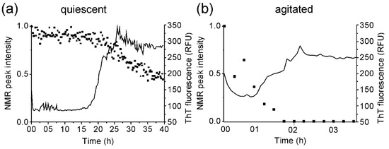 Figure 1. Fibrillation of medin. Thioflavin (ThT) fluorescence (solid line) for 20 µM medin incubated in 20 mM NaPhos, 20 mM NaCl, pH 7.4 at 37 °C under (a) quiescent and (b) agitated conditions. Results are shown as the mean of three replicates. NMR peak intensity (symbols) normalised to starting intensity.