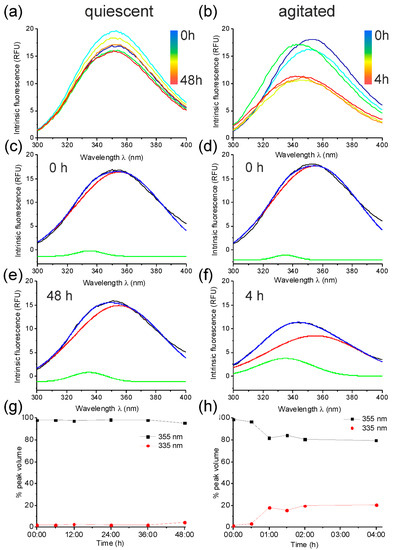Medin contains two tryptophan residues at positions 11 and 21. Intrinsic tryptophan fluorescence investigates the relative solvent exposure of these residues [21]. The IF spectrum for freshly prepared, soluble medin had an emission maximum at 355 nm, suggesting that the tryptophan residues were solvent exposed (i.e., unfolded) (Figure 2). This is consistent with previous CD data suggesting medin contains a mixture of random coil and β-sheet structures [22,23,24]. Upon incubation, this peak displayed a blue shift (towards a lower wavelength), suggesting that the tryptophan residues were becoming less solvent exposed (i.e., buried within a secondary structure conformation) (Figure 2a,b). Deconvolution of the IF spectra for medin aggregation under agitated and quiescent conditions with nonlinear least-squares fitted spectra approximated by two Gaussian components—centred at 355 nm (solvent-exposed) and 335 nm (buried)—gave different profiles for aggregation over time, dependent upon incubation conditions (Figure 2g,h). Quiescent conditions showed a minimal shift in peak maxima (Figure 2c,e), which was reflected in the deconvolution summary (Figure 2g). However, agitated growth gave a larger shift of up to 10 nm (Figure 2d,f), and a larger change in volume upon deconvolution, which occurred at approx. 60 min, consistent with the lag time observed by ThT fluorescence (Figure 1b and Figure 2h). Agitated growth results in fibrils, in which tryptophan residues are less exposed to the surrounding solvent than in fibrils grown under quiescent conditions.