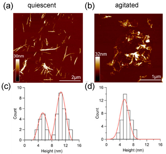 Figure 3. Atomic Force Microscopy Analysis. Fibrils formed under (a) quiescent and (b) agitated conditions. Height distribution analysis shows (c) two height populations of 5.1 ± 1.0 (n = 170) and 10.7 ±1.4 nm (n = 90) for quiescent fibrils, (d) with only one species of average height 5.3 ± 1.1 nm for agitated fibrils.
