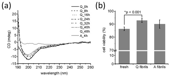 Figure 4. Properties of fibrils formed under quiescent and agitated incubation. (a) Circular dichroism (CD) shows that following incubation of medin for 48 h under quiescent (Q) conditions there is still a CD signal remaining (dashed line), whereas incubation under agitated (A) conditions has no detectable CD signal remaining (dotted lines). Analysis of the spectra using CONTINLL suggests that quiescent fibrils have increased β-sheet structures compared to freshly prepared medin (Table 1). (b) Cell viability of human aortic smooth muscle cells (HAoSMC) after exposure to freshly prepared and aggregated medin, as determined by Cell Counting Kit-8 (CCK-8) assay; mean ± SEM is shown for n = 5. There is no statistical difference between A and Q fibrils assessed by t-test.