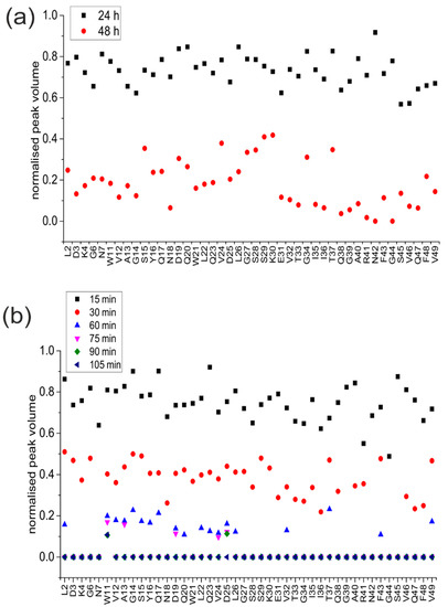 Figure 5. Site-specific NMR analysis. Normalised peak volume relative to starting volume for (a) quiescent incubation at 24 and 48 h, and (b) agitated incubation at 15, 30, 60, 75, 90 and 105 min.