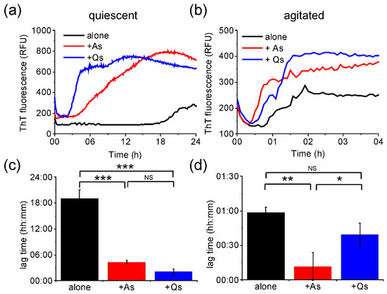Figure 6. Fibrillation of medin in the presence of pre-formed medin seeds. ThT fluorescence for 20 µM medin incubated in 20 mM NaPhos, 20 mM NaCl, pH 7.4 at 37 °C under (a) quiescent (b) and agitated conditions. Medin alone (black), and in the presence of 5% v/v preformed fibril seeds formed with agitation (As, red), or quiescent (Qs, blue). Results are shown as the mean of three replicates. Lag time calculated by fitting the ThT curves as described previously [23,27] for (c) quiescent and (d) agitated data. Data are shown as the mean ± SD for triplicate curves. NS non-significant; * p < 0.05; ** p < 0.005; *** p < 0.00005. p values were obtained using ANOVA with Bonferroni means comparison.