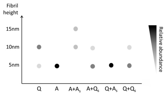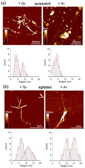 Based on the AFM height measurement alone, three types ( s 1 ,   s 2 , s 3 ) of fibrils can be identified, which were around 5, 10 and 15 nm, respectively (Figure 8). Focusing first on the system without sonicated seeds (the first two columns in Figure 8), we observe that, under the quiescent condition (Q), both s 1 and s 2 can be nucleated, while under the agitated condition (A), species s 1 dominates. When these incubated seeds are sonicated and then used to seed the system under both quiescent and agitated conditions, we see that the species present in the system remains the same, except for the case of the system under agitated condition seeded by sonicated fibrils incubated under agitated condition (A + As). In this case, species s 1 seems to disappear from the system, while species s 2 and s 3 emerge.