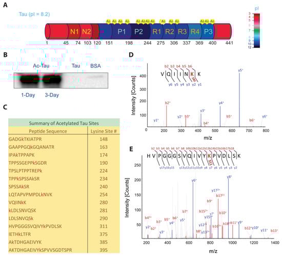 Tau hyperacetylation. (A) Domain organization of Tau. Protein segments are color-coded to reflect their respective pIs using the provided color palette. (B) In vitro Tau acetylation was verified by Western blot against acetyl-lysine (left to right lanes: acetylated Tau after one- and three-day reaction incubations, and negative controls using wild-type Tau and BSA, respectively). (C) Tau lysine acetylation sites (red) identified by mass spectrometry. (D,E) MS/MS spectra of peptides that contain the hexapeptide aggregation motifs VQIINK280K281 and VQIVYK311, showing acetylation at K280 and K311, respectively (shown in red). The ‘b’ ions (shown in red) represent fragment peaks generated from the amino to carboxyl terminus. The ‘y’ ions (shown in blue) represent fragment peaks generated from the carboxyl to amino terminus. The suffix numbers represent the corresponding number of amino acids. See Section 3 for details.