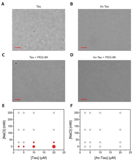 LLPS has recently been observed for wt and hyperphosphorylated Tau, and truncation mutant (K18) [,,,]. At low salt conditions (5 mM sodium phosphate, pH 7.8), we observed near-instantaneous formation of wt Tau droplets (Figure 2A). Subsequent fusions indicate the liquid nature of the wt Tau droplets. We characterized the protein concentration (2.5–20 µM) and salt concentration (0–250 mM NaCl) dependencies of wt Tau LLPS. Consistent with the literature [,], higher salt concentrations disfavor LLPS and higher protein concentrations favor LLPS (Figure 2E). For the case of Ac-Tau, we observed a dramatic reduction in droplet formation (Figure 2B,F). Similar results were also observed when LLPS experiments were performed with wt Tau or Ac-Tau in the presence of a crowding agent (10% PEG 8K, 200 mM NaCl, 10 mM acetate, 10 mM glycine, 10 mM sodium phosphate, pH 7.5; Figure 2C,D). Thus, independent of the presence or absence of crowding, the hyperacetylation of Tau disfavors LLPS.