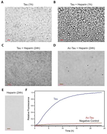 Acetylation disfavors heparin-induced Tau aggregation. (A,B) Heparin accelerates non-acetylated wt Tau LLPS. The presence of heparin (5 µM heparin: 20 µM Tau ratio) results in more droplets and larger fused droplets at the bottom of the dish. Droplet formation was not observed for Ac-Tau in the absence (Figure 2B,D) or presence of heparin (24 h, (D)). After 24 h incubation, an abundance of irregularly-shaped oligomers/aggregates was observed for wt Tau but not for Ac-Tau (C,D). No aggregation/LLPS was observed for the heparin control (E). Ac-Tau displayed minimal aggregation compared to wt Tau as reported by Th T fluorescence assay (F). Scale bars represent 10 µm. See Section 3 for details.