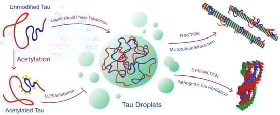 Less direct effects on physiologic Tau function may also be important. Many of the same lysines (K254, K311, and K353) implicated as sites of ubiquitination [] are also sites of acetylation and, thus, might be involved in evading the ubiquitin-lysosome proteasomal degradation machinery. Acetylation has been shown to inhibit Tau degradation by inhibiting its ubiquitination [], and results in the accumulation of Tau, including hyperphosphorylated Tau. The presence of lysine deacetylase (SIRT1) has been shown to inhibit neuronal loss in an AD mouse model and deletion of SIRT1 results to pathologic levels of Tau in vivo []. Cross-talk between the different PTMs has also been reported. For example, hypoacetylation of Tau at key KIGS motifs in the R1-4 regions increases vulnerability to hyperphosphorylation, which leads to filament aggregation []. Hyperphosphorylation of Tau has been reported to enhance Tau LLPS. However, other reports also show that hyperphosphorylation reduces microtubule assembly []. Thus, LLPS-mediated mechanisms by hyperphosphorylated Tau could be detrimental for both function and dysfunction pathways (Figure 5). We plan to carry out further experiments on hyperphosphorylated Tau to assess how this PTM of Tau can modulate microtubule assembly and protein aggregation, both in LLPS and non-LLPS conditions. Nevertheless, we speculate that the hyperacetylation of Tau is detrimental to Tau function, but not instrumental to LLPS-mediated Tau dysfunction (Figure 5). It would also be interesting to know the cross-talks between hyperphosphorylation and hyperacetylation in LLPS-mediated microtubule assembly and promotion of pathologic fibrils. Can hyperphosphorylated Tau also recruit hyperacetylated Tau into droplets? If so, this might explain the presence of hyperacetylated Tau in pathological inclusions of hyperphosphorylated Tau.