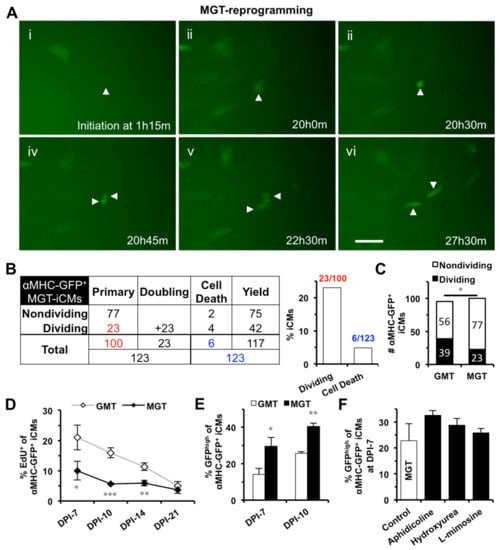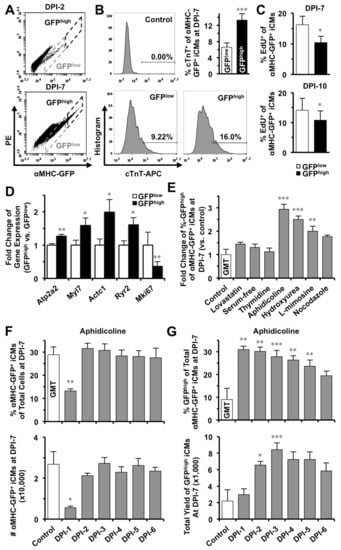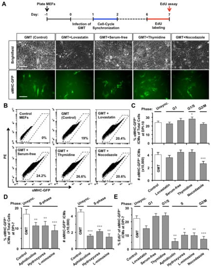 2.3. S- or G2/M-Phase Synchronization at DPI-1 Facilitates Cell-Cycle Exit of GMT-iCMs