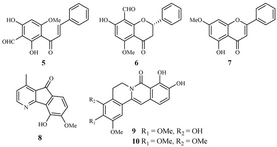 Annonaceae is a family of flowering plants consisting of about 2400 species. Two plants in this family have been phytochemically investigated for their antiplasmodial and cytotoxic activities. From the leaves of Friesodielsia discolor, Prawat et al. isolated two new flavonoids, 3′-formyl-2′,4′-dihydroxy-6′-methoxychalcone (5), 8-formyl-7-hydroxy-5-methoxyflava-none (6), and the known tectochrysin (7) (Figure 3) [31]. They displayed antiplasmodial activity against the K1 multidrug resistant strain of P. falciparum with IC50 values of 9.2, 9.3 and 7.8 μM, respectively. However, these compounds also exhibited cytotoxicity against the cancer cell lines KB and MCF-7, with the IC50 values ranging from 13.9–34.5 μM.