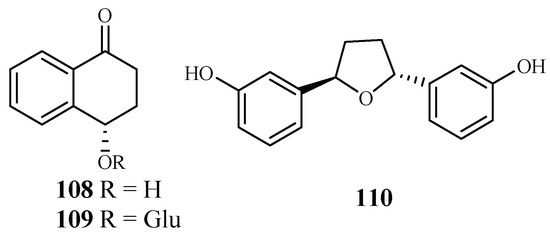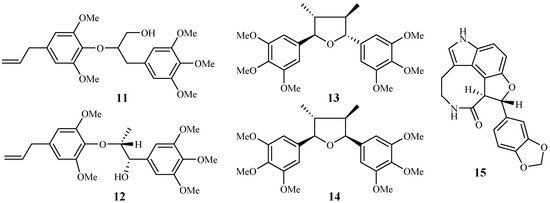Zhang et al. [22,23] performed extensive research on Rhaphidophora decursiva, a vine growing in Vietnam. The MeOH extract of the plant leaves and stems showed antimalarial activity against both D6 and W2 clones with no apparent cytotoxicity at a concentration of 20 μg/mL. Seven compounds were identified from the stems and leaves of the plant through a bioassay-guided separation (Figure 4). Polysyphorin (1) and rhaphidecurperoxin (2) were among the most active compounds, which demonstrated antimalarial activity with IC50 values of 1.4–1.8 μM against the D6 and W2 strains and cytotoxicity with ED50 values of 8.3–13.1 μM against KB cells (Figure 2). Rhaphidecursinols A (11) and B (12), grandisin (13), epigrandisin (14) and decursivine (15) also showed activities against P. falciparum (D6 and W2) with IC50 values of 3.4–12.9 μM and cytotoxicity of ED50 values of 23.9–37.0 μM against KB cells with an exception of compound 14, which showed no antimalarial activity against D6 strain at 23 μM.