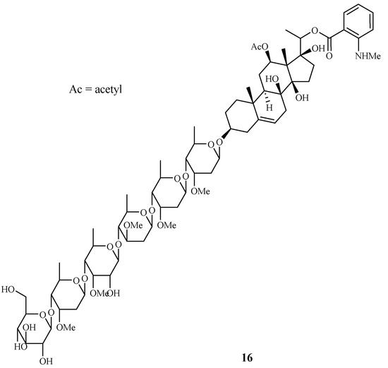 Libman et al. reported the antimalarial bioassay-directed separation of Gongronema napalense, leading to the identification of a new steroidal glycoside, gongroneside A (16) (Figure 5) [25]. The compound showed inhibitory activity against the D6 and W2 clones with IC50 values of 1.6 and 1.4 μM, respectively. Gongroneside A showed no cytotoxicity against KB cells at a concentration of 13.7 μM.