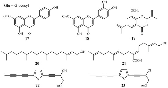 Apigenin 7-O-glucoside (17) and luteolin 7-O-glucoside (18), two flavonoid glycosides obtained from the aerial parts of Achillea millefolium, showed antiplasmodial activities against D10 and W2 strains with IC50 values in the range of 15.3–62.5 μM [34] (Figure 6).
