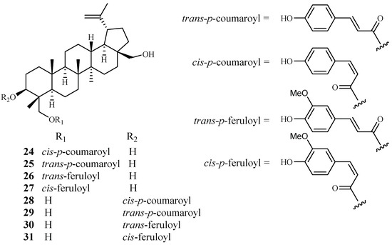 Cai et al. identified several new antimalarial compounds from Buxus sempervirens [38], the native and introduced plant species in the United States. The traditionally used plants have received scant attention as potential source materials for drug discovery research as compared to the botanical materials from tropical and semitropical areas of the world. The eight lupane triterpenes (24–31), isolated from the Buxus plant (Figure 7), were evaluated for their activity against multi-drug-resistant malaria parasites (HB3, IC50 0.5–3.0 μM) and counterscreened against HeLa cells (IC50 7 μM for 24; >20 μM for 25–31). Strikingly, 23-O-(trans)-feruloyl-23-hydroxybetulin (26) displayed antimalarial activity at a concentration that was 75-fold more selective to the drug-resistant parasite strain than to HeLa cells.