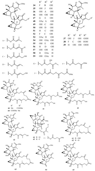 Yue et al. [40] recently reported the isolation of 32 antimalarial lindenane-type sesquiterpenoids (34–65) from several plants in Chloranthaceae family with IC50 values lower than 11.4 µM against P. falciparum strain Dd2. The 12 new sesquiterpenoid dimers fortunilides A−L (34–45), along with 7 known isolates (46–51 and 53) were isolated from C. fortune. Compounds 52, 54, 58, 59 and 60–64 were obtained from C. serratus and C. spicatus, and compounds 55–57 were separated from Sarcandra glabra. Compound 65 was originated from C. multisachys. Among these isolates, fortunilide A (34), sarglabolide J (47) and chlorajaponilide C (52) exhibited low nanomolar activities with IC50 values of 5.2, 7.2 and 1.1 nM, respectively, and their selectivity index values toward mammalian cells were greater than 500 (Figure 9).