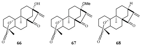 From the Petroleum ether/CH2Cl2 extracts of the stems of Parinari capensis, three kaurene diterpene lactones, 10, 13-dihydroxy-9-methyl-15-oxo-20-norkaur-16-en-18-oic acid γ-lactone (66), 10-hydroxy-13-methoxy-9-methyl-15-oxo-20-norkaur-16-en-18-oic acid γ-lactone (67) and 10-hydroxy-9-methyl-15-oxo-20-norkaur-16-en-18-oic acid γ-lactone (68) were isolated (Figure 10) [41]. They possess antimalarial activity against FCR-3 with IC50 values of 1.7, 1.9 and 5.0 µM, respectively.